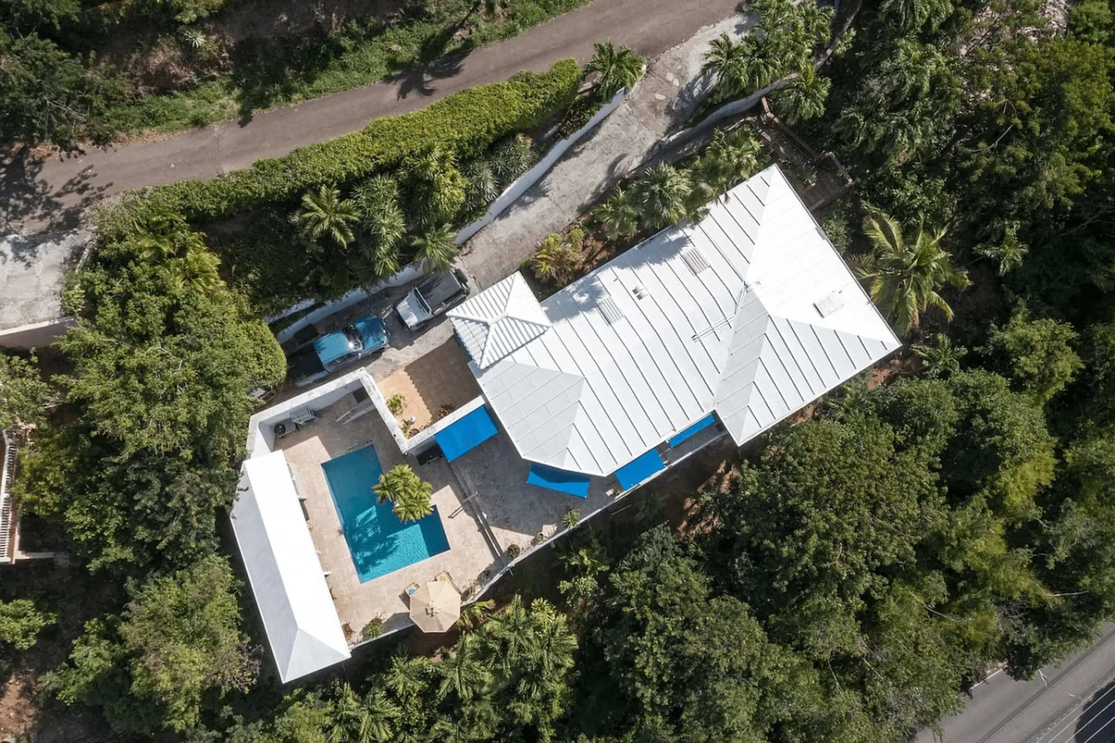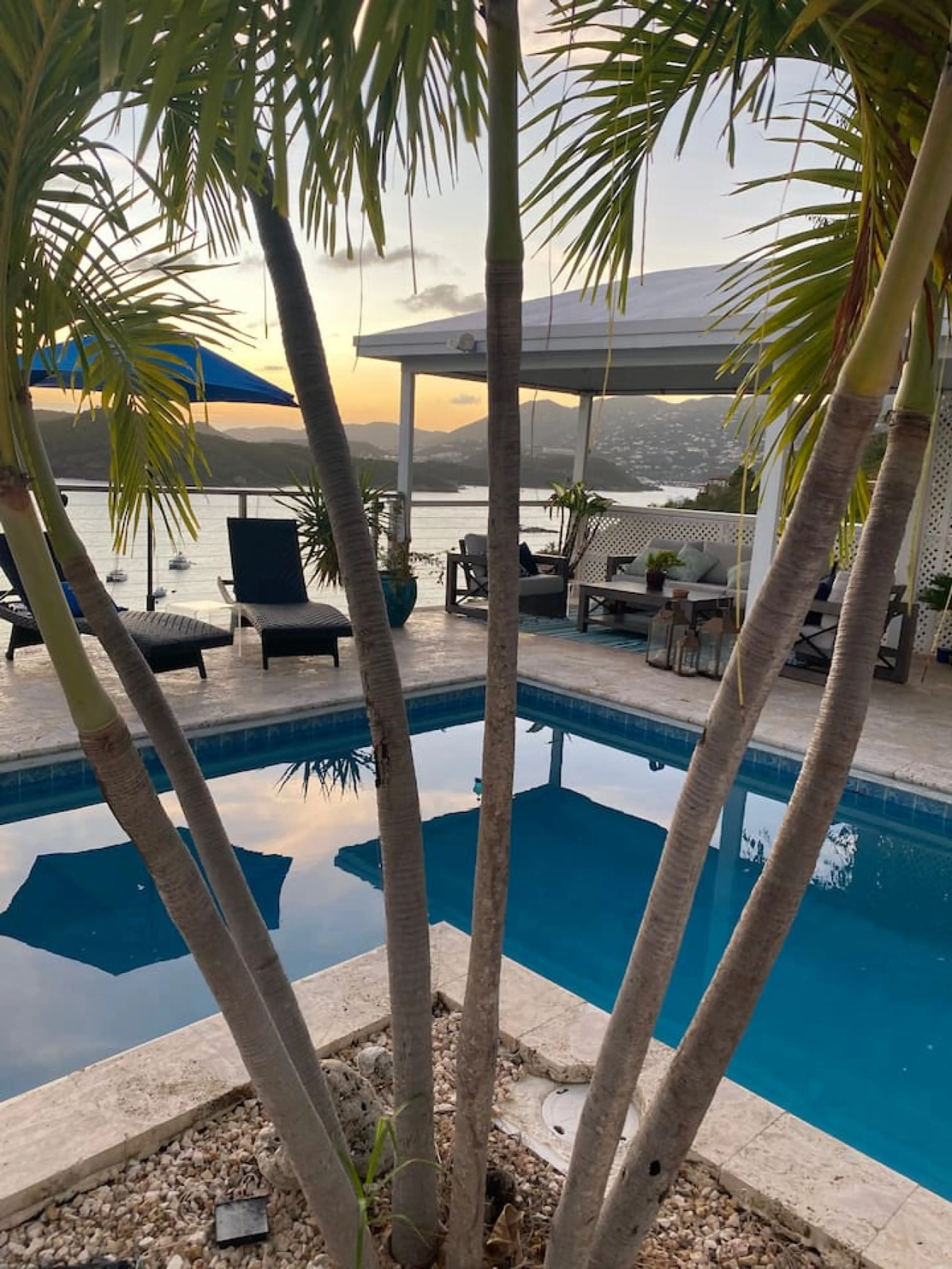 Breathtaking sunset and ocean views from this gorgeous villa nestled among the trees in paradise. A generous living space with oversized sectional effortlessly flows into the outdoor patio and pool area, perfect for sunbathing, a BBQ with friends and family, or a cocktail under the shaded cabana ar...
